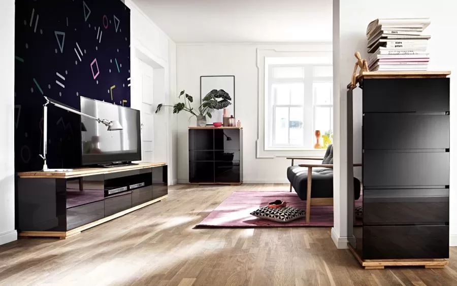 Dzięki połączeniu czarnych połyskujących frontów z naturalnym drewnem mebel przepięknie zdobi każde wnętrze. Piękny blat natomiast będzie idealnym miejscem do wyeksponowania pnącego kwiatka doniczkowego, ceramiki czy książek.