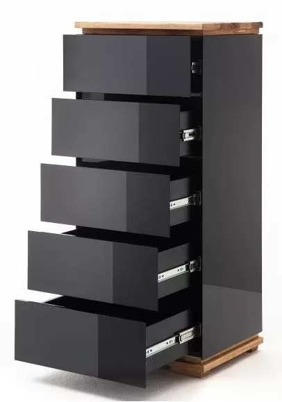 Wąska komoda CHIARO BLACK to komoda uzupełniająca z całej rodziny komód CHIARO. Nowoczesna komoda CHIARO jest niezwykle przydatna. Posiada aż pięć pojemnych szuflad które można wykorzystać zarówno w sypialni na bieliznę czy dodatki jak i w salonie. Dodatkowo szuflady posiadają mechanizm cichego domknięcia, dzięki czemu unikniemy trzaskania przy ich zamykaniu.
