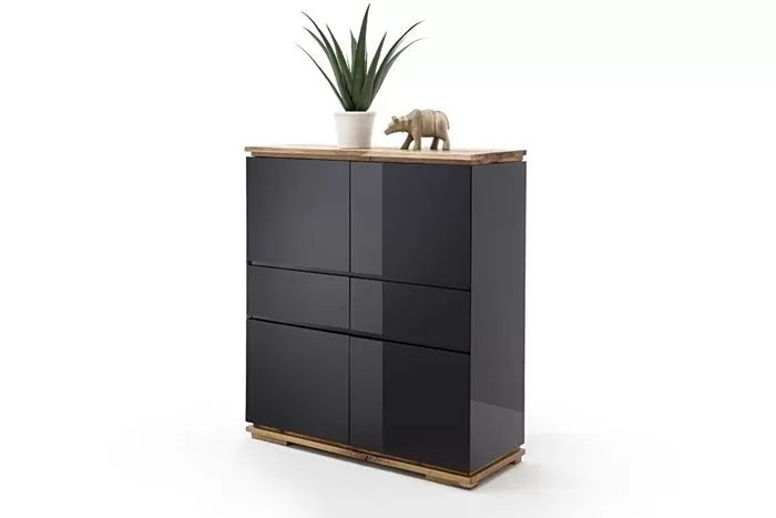 Czarna komoda CHIARO to szczególny mebel w ofercie mebli nowoczesnych. Dzięki połączeniu lakierowanych frontów z naturalnym drewnem mebel przepięknie zdobi każde wnętrze. Dodatkowo fronty wykonane są w połysku co jeszcze bardziej ubogaca jej wygląd. Kolekcja CHIARO otrzymała nagrodę mebel plus PRODUKT ROKU 2019