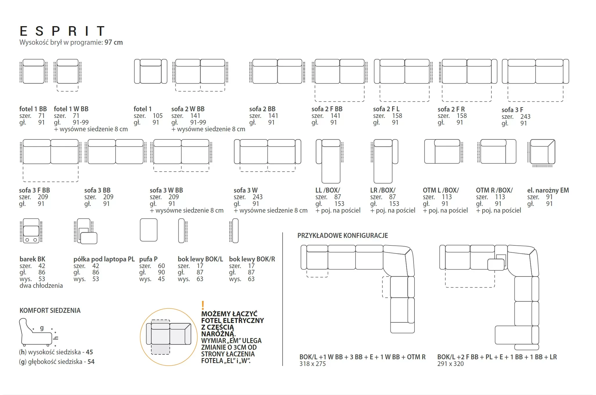To program mebli z charakterystycznymi stopkami meblowymi i szyciem na siedzeniach. Komfort modelu ESPRIT, podobnie jak w każdym zestawie mebla jest sumą umiejętności i co dziennych doświadczeń naszych projektantów i technologów. To za ich sprawą wygoda i proporcje doskonałej ergonomii ubogaca dobrymi doznaniami czas spędzony na dowolnie skonfigurowanych zestawach. Zwarzywszy na to, że program ESPRIT posiada rozkładaną funkcję spania całość musiała być wykonana z materiałów o wysokiej jakości i wytrzymałości. Ponadto na szczególną uwagę zasługuje fakt, że mechanizm spania w żaden sposób nie uszkodzi powierzchni podłogi ani innych elementów jej dekoracji.