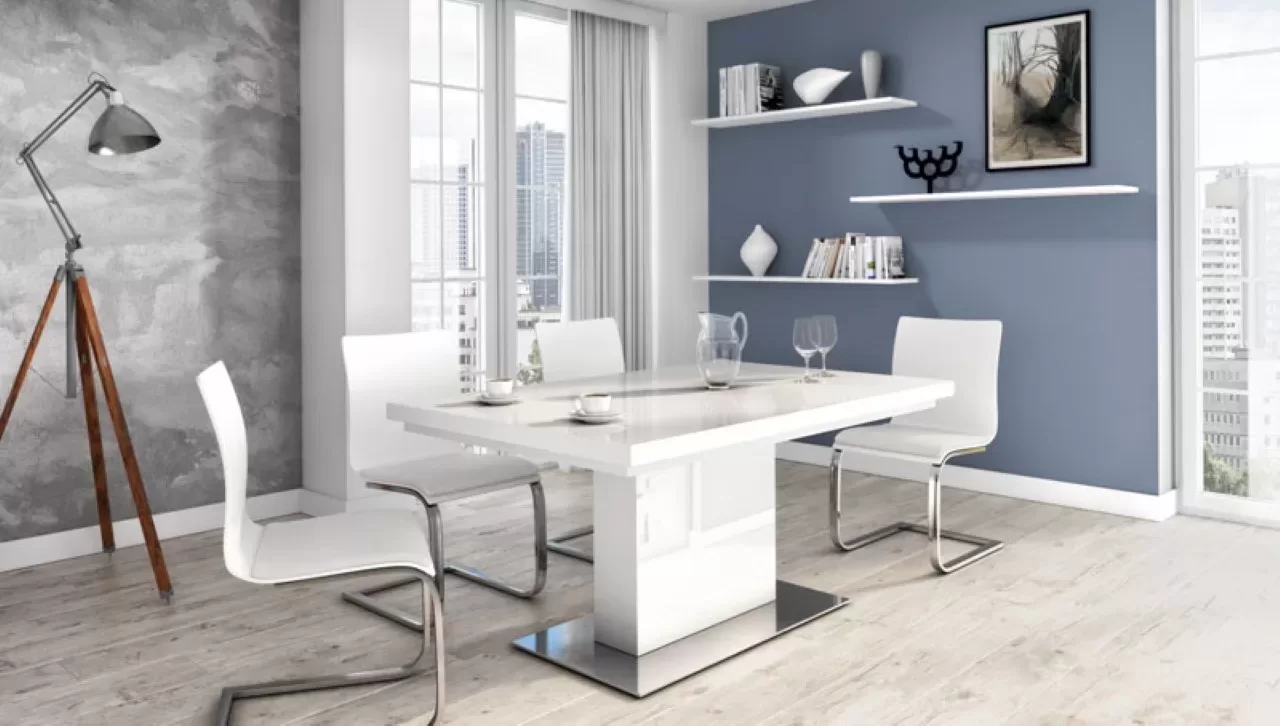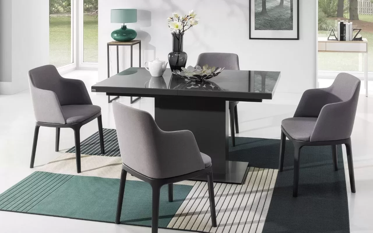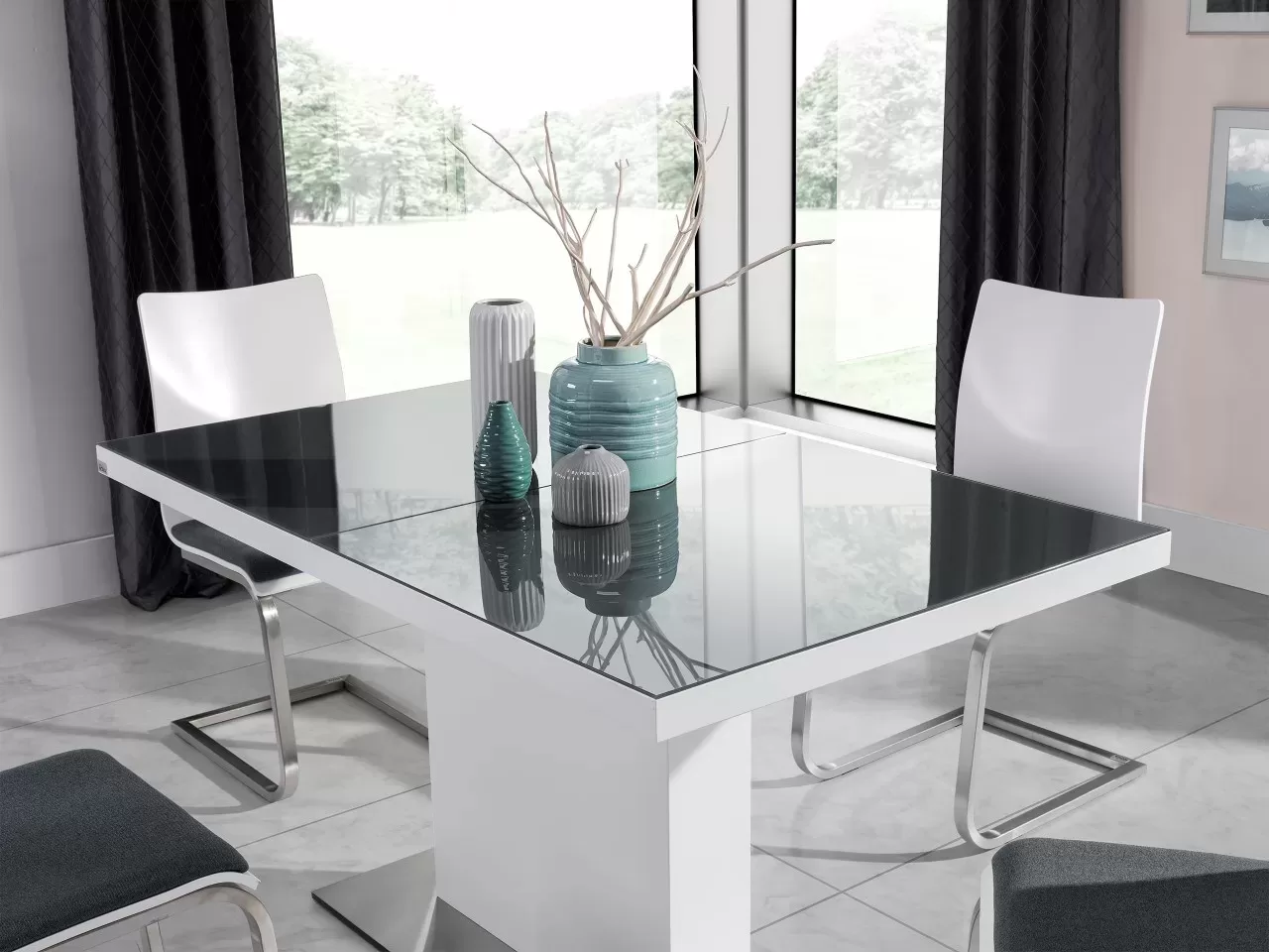 Dostępne wersje: blat szklany biały, blat szklany czarny. Kolorystyka stołów: biały, gładki, czarny gładki, szampański, jasny, szary, stalowy