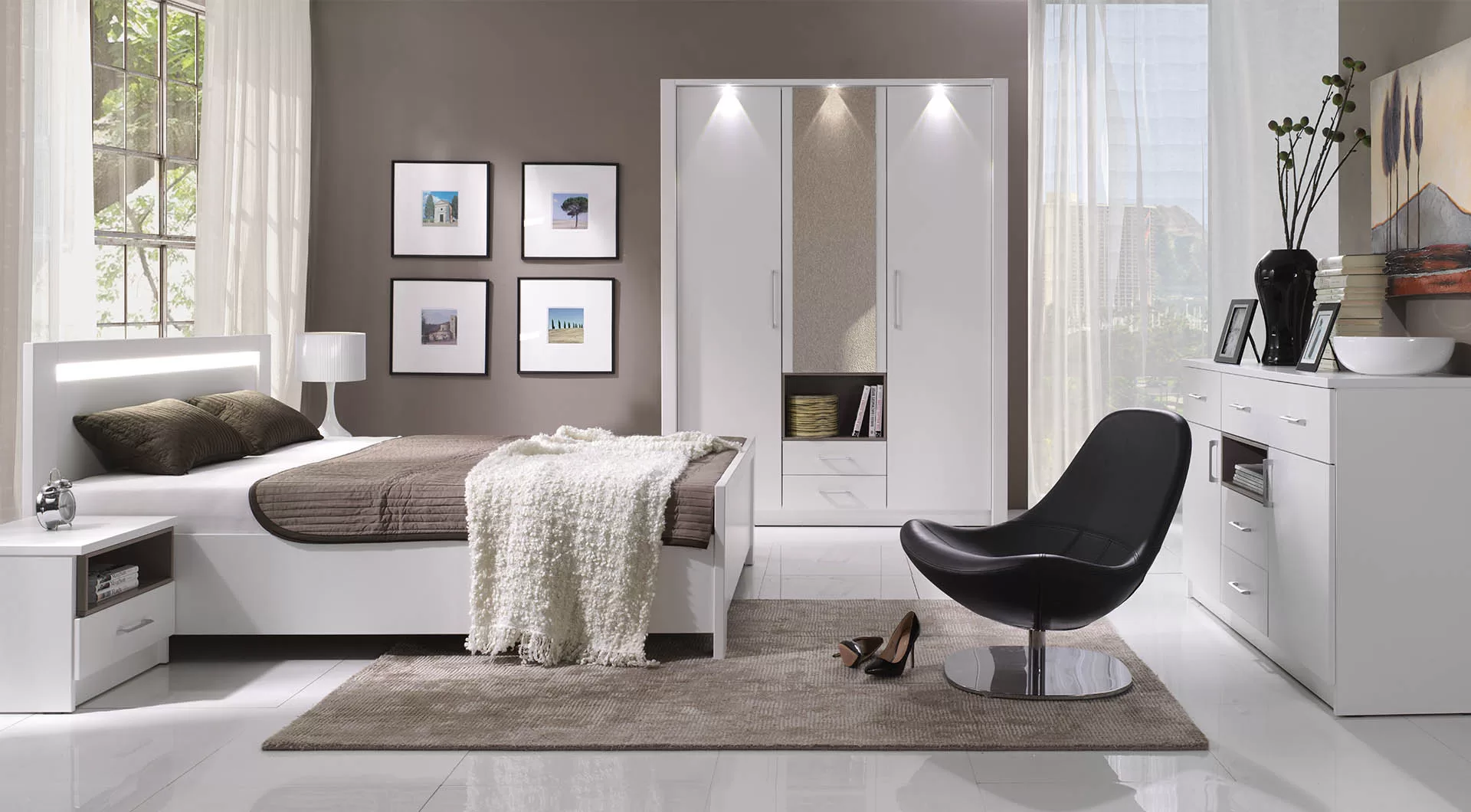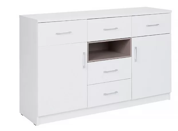 Komoda NYKO-2D5S z kolekcji New York to wyjątkowy mebel sypialniany od marki New Elegance Furniture. Komoda wykonana z najwyższej jakości płyty laminowanej z obrzeżami ABS świetnie dopełni wystrój niemal każdego nowoczesnego, przestronnego wnętrza, które aranżowane jest w stylu minimalistycznym lub skandynawskim. Komoda New York to gwarancja najwyższej jakości wykonania i zastosowania licznych funkcjonalności, które zwiększają komfort podczas używania mebla. Po bokach komody New York umieszczono dwoje drzwiczek otwieranych uchylnie, a w centralnej części znaleźć można dwie nieduże szuflady i jedną otwieraną, małą półeczkę. U góry komody zastosowano także trzy szuflady na drobiazgi.