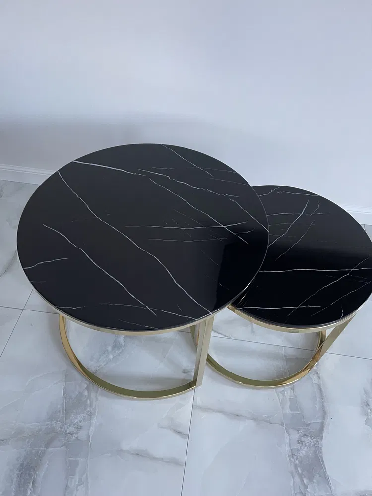 Ława MUSE to zestaw 2 ław do salonu utrzymanych w stylistyce glamour. Blaty tych eleganckich ław wykonane zostały ze szkła hartowanego imitującego czarny marmur, a podstawe ław wykonano  ze stali nierdzewnej pomalowanej  na złoty kolor, który wspaniale współgra z czernią blatu. Ze względu na specjalnie zaprojektowane podstawy mniejszą ławę można z łatwością wsunąć pod dużą ławę. Stoliki kawowe mogą stanowić w salonie praktyczny komplet lub być zastosowane w dwóch różnych miejscach.