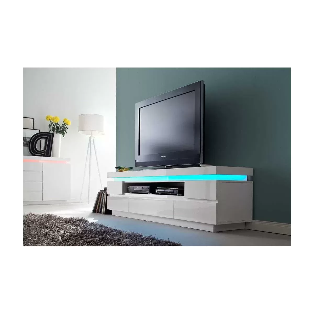 Mebel posiada oświetlenie RGB, które pozwala na zmianę koloru oświetlenia.