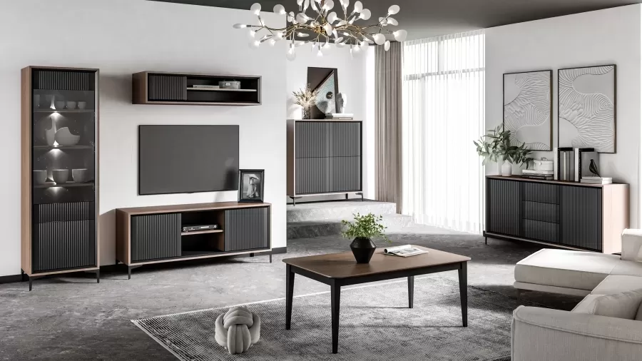 System mebli Linea stworzony został z myślą o nowoczesnych trendach aranżacyjnych oraz wnętrzach urządzanych w stylu industrialnym. Kolekcja charakteryzuje się geometryczną prostotą, a jej urozmaiceniem jest zastosowanie frontów ryflowanych. Pionowe zdobienia nadają bryłom nuty nonszalancji. Delikatny akcent w postaci korpusu wykonanego w fornirze o zimnym, stonowanym kolorze pozwala na stworzenie spójnej i niepowtarzalnej kompozycji