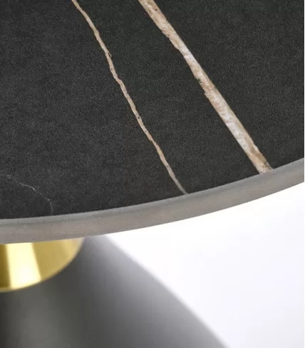 Stolik kawowy MORENA to jeden z tych mebli, obok których trudno przejść obojętnie. Stolik zachwyca ze względu na swój design oraz nieoczywiste połączenie materiałów. Projekt jest niezwykle nowoczesny, dlatego idealnie wpisze się w gusta poszukiwaczy wyjątkowych elementów wyposażenia wnętrza. Stolik składa się z okrągłego blatu ceramicznego z imitacją zielonego marmuru. Ceramiczny blat mieści na metalowej nodze, malowanej metodą proszkową na kolor czarny ze złotym elementem ozdobnym. Połączenie zielonego marmuru, złota oraz czerni sprawia, że mamy do dyspozycji niezwykle elegancki mebel, który będzie wyróżniał się luksusowym charakterem przez długie lata.