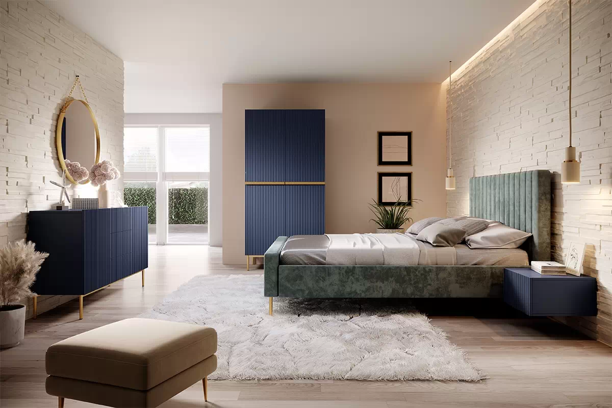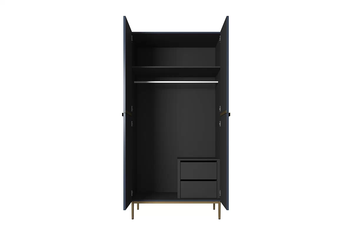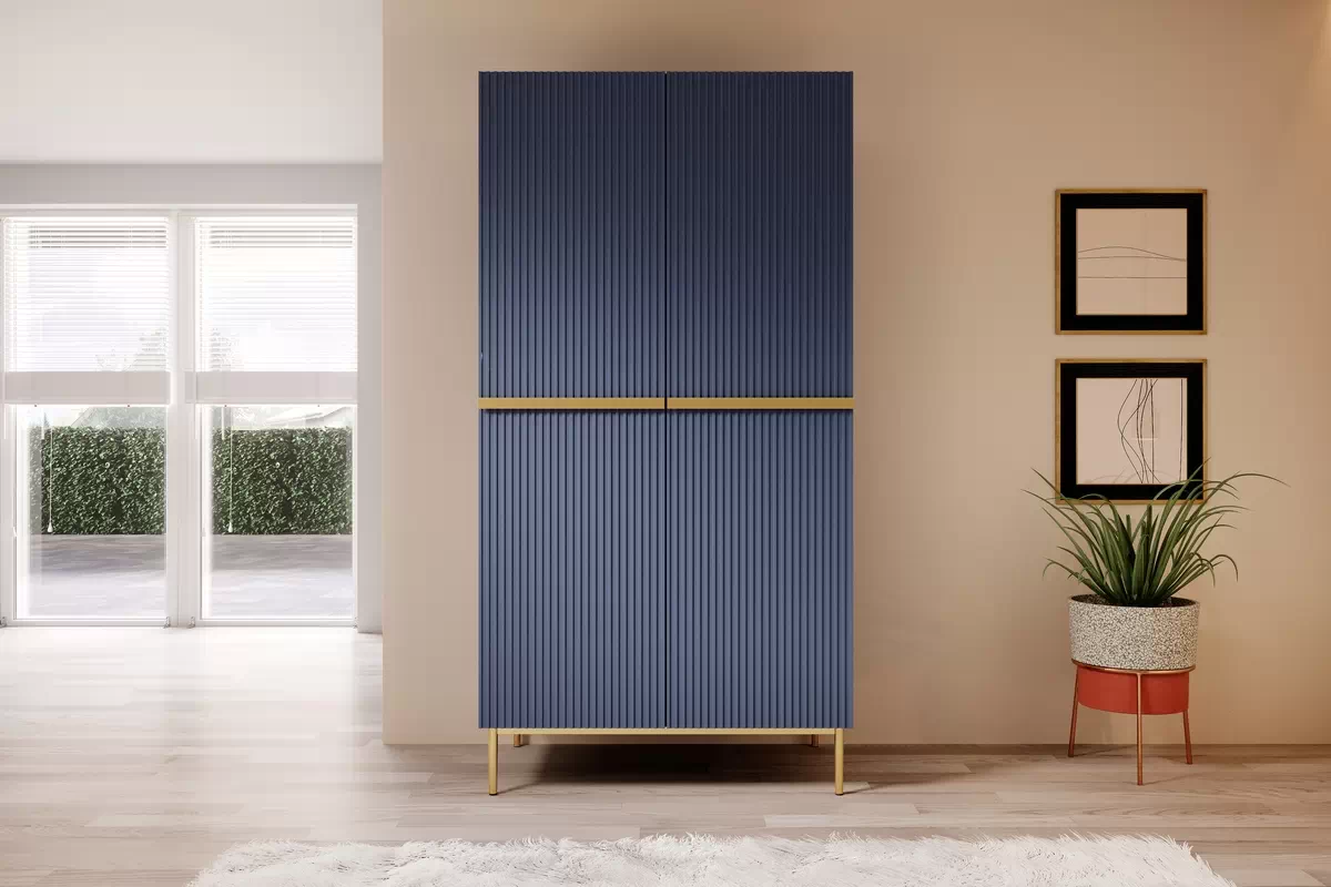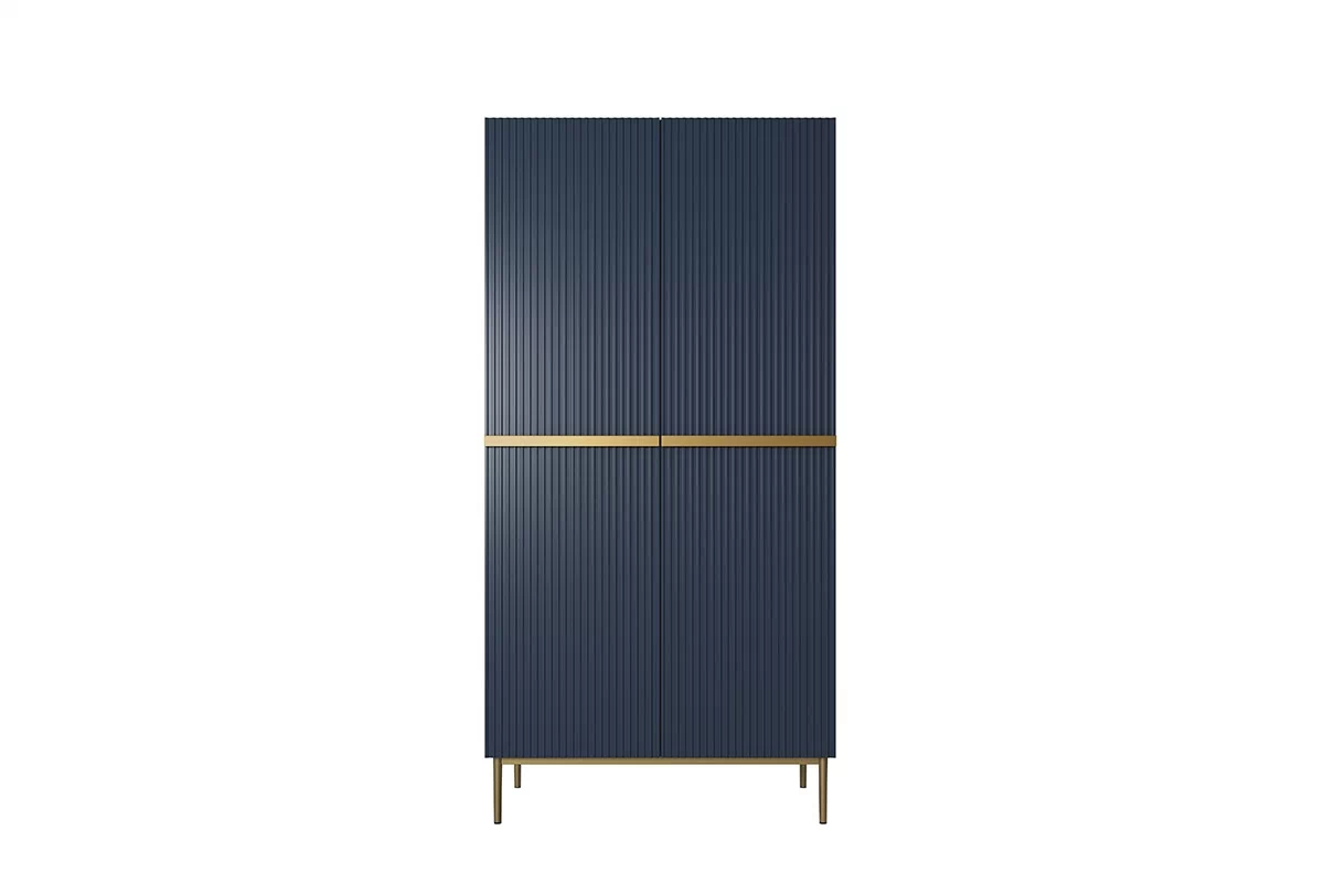 Szafa Nicole to idealna propozycja dla osób, które cenią sobie elegancki design i wysoką jakość wykonania. Jej granatowa kolorystyka, ryflowane fronty oraz złote metalowe uchwyty i nóżki nadają jej wyjątkowego stylu. Jeśli zależy Ci na nowoczesnym i eleganckim wystroju swojej garderoby, szafa Nicole jest dla Ciebie.