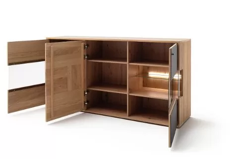 Komoda Valencia wyposażona jest w 3 drzwi, z czego 2 drzwi jest szklanych. Oświetlenie LED opcjonalnie.