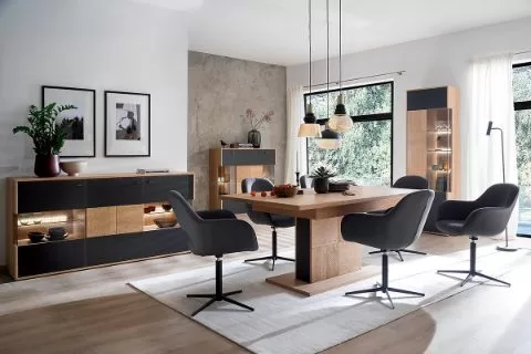 Komoda 3-drzwiowa Valencia to połączenie naturalnego drewna i antracytu, czyli bardzo ciemnego, głębokiego odcienia szarości. To jest bardzo modne i estetyczne połączenie kolorystyczne.