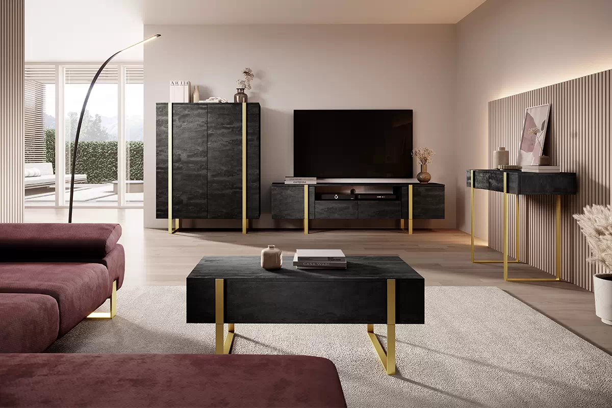 Mebel o szerokości 120 cm został zaprojektowany i stworzony z myślą o fanach nowoczesnych rozwiązań. Ciemna kolorystyka w odcieniu charcoal doskonale łączy się ze złotymi uchwytami, jak i nóżkami. Komoda Verica w zestawieniu z pozostałymi bryłami systemu stworzy spójną kompozycję w salonie lub pokoju dziennym, która sprosta naszym oczekiwaniom. Komoda wewnątrz skrywa sześć praktycznych półek, które sprawdzą się jako idealne miejsce do przechowywania różnych akcesoriów. Na blacie możemy wyeksponować pamiątki lub elementy dekoracyjne, natomiast nóżki zagwarantują wystarczającą przestrzeń dla robota sprzątającego. Bez wątpienia nie można odmówić komodzie Verica solidności potwierdzonej wytrzymałą płytą meblową (18 mm) zastosowaną na korpusie oraz froncie. Mało tego! Stabilny stelaż oraz uchwyty to trwały metal malowany proszkowo na ten sam piękny złoty kolor. Otwieranie drzwiczek zalecamy za pomocą funkcji push to open, jednak istnieje również możliwość otwierania za metalowy uchwyt.