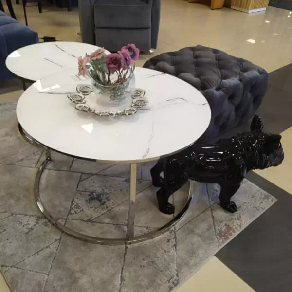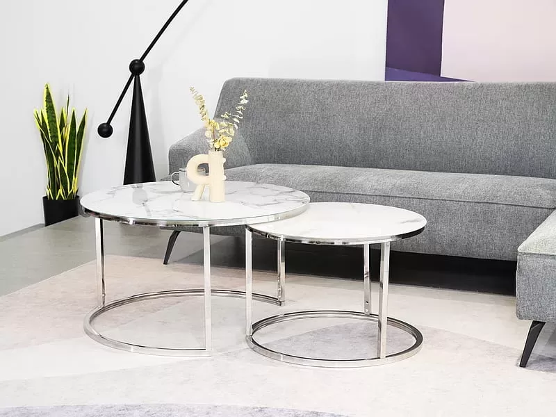 Blaty obu ław Atlanta wykonane są ze szkła hartowanego są białe z efektem marmuru, dzięki czemu elegancko się prezentują. Zaletą zastosowania szkła hartowanego jest łatwe utrzymanie blatów w czystości, a także możliwość stawiania gorących naczyń na powierzchni. Kszałt podstaw pozwala wsunąć mniejszą ławę pod większą. Zestaw 2 ław ATLANTA B można ustawić w salonie obok siebie lub w zupełnie różnych miejscach. Niezależnie od tego, gdzie i jak je ustawimy będą one fantastycznym uzupełnieniem aranżacji salonu.